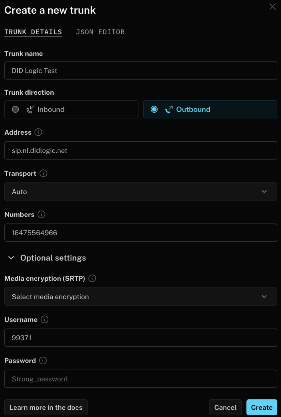 *(wildcard) to allow the trunk to handle calls from any assigned number. This is useful if you want to use a different phone number for each call. - Media encryption (SRTP): Configure based on your security requirements.