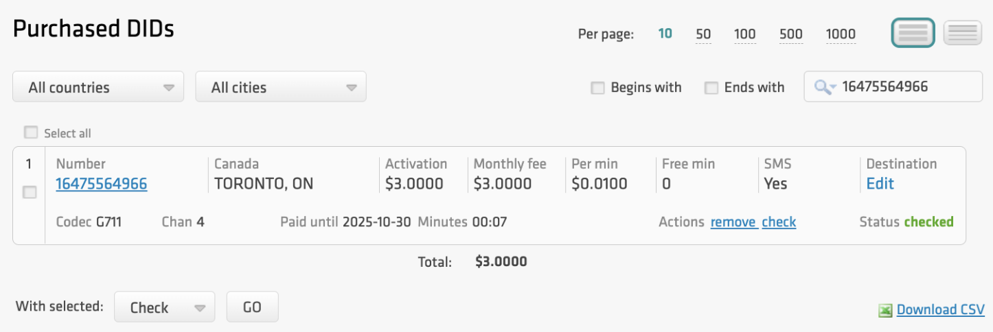 Log in to your didlogic account and go to Numbers → Purchased.