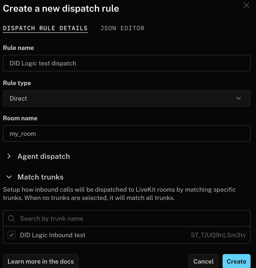 Once the inbound trunk is ready, you must create a Dispatch Rule to define which LiveKit room a caller joins. Navigate to Telephony → Configuration → + Create New → Dispatch Rule to link your number to a room.