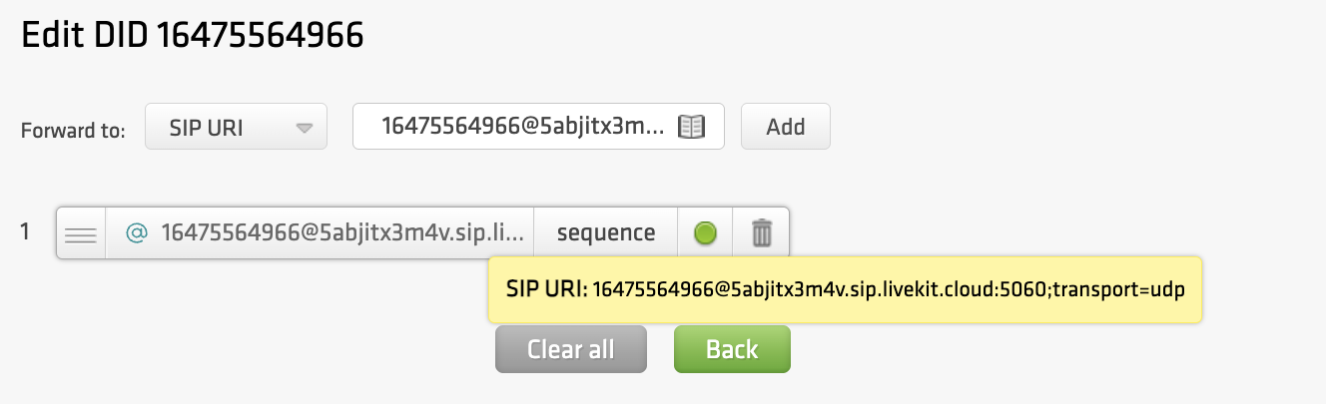 Finally, point your didlogic number to the LiveKit SIP gateway to complete the loop.