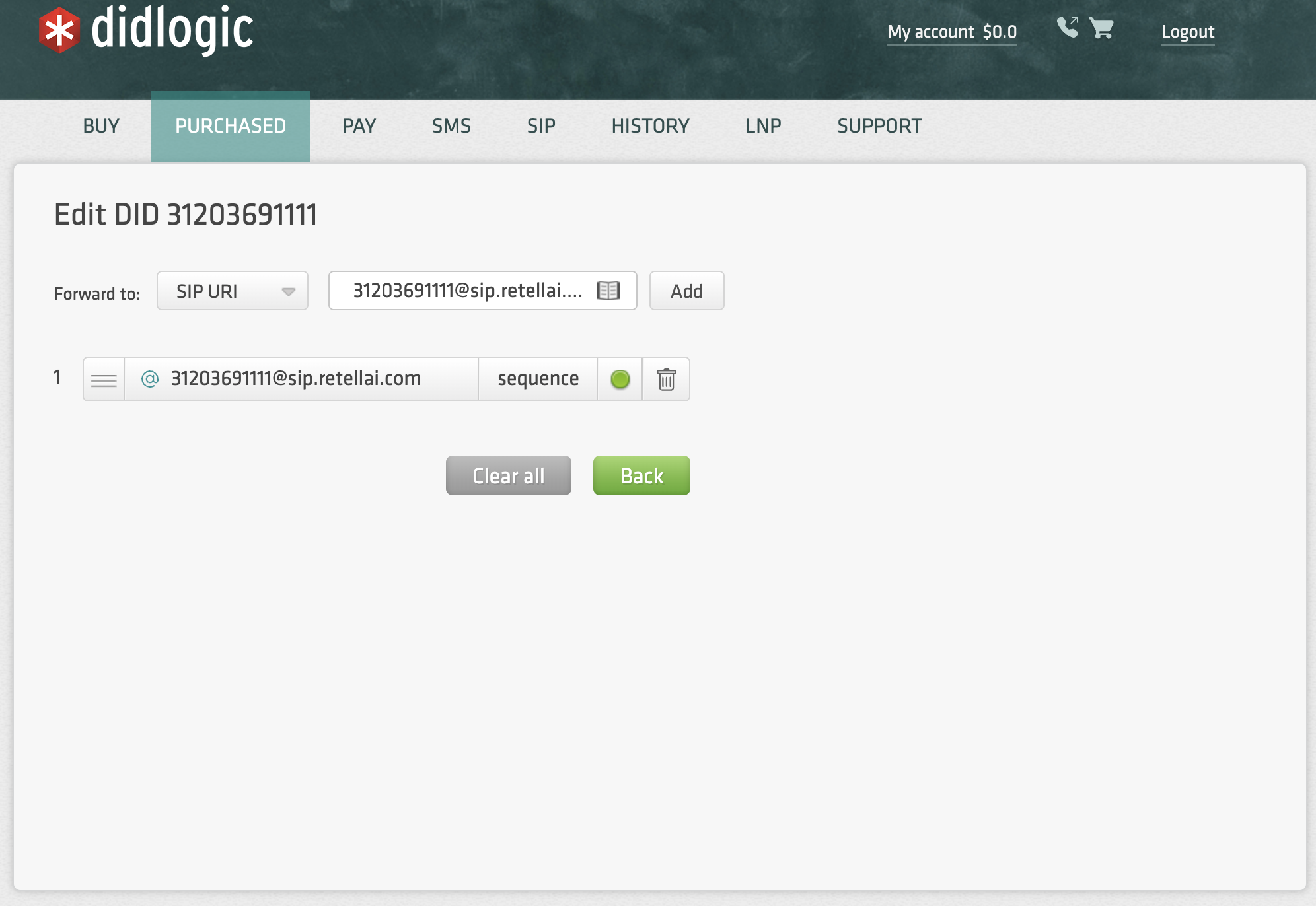 Once the number is added to Retell, you must point your didlogic number to Retell's SIP gateway.