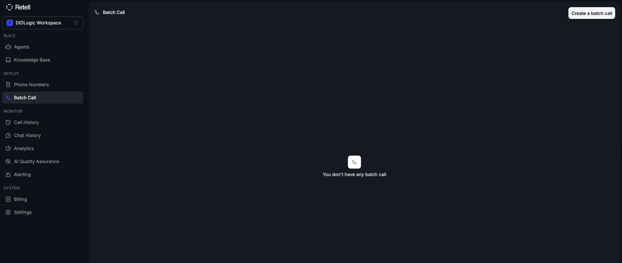 - Batch Campaigns: Use the Batch Call sidebar menu to upload a CSV of recipients for high-volume outreach.