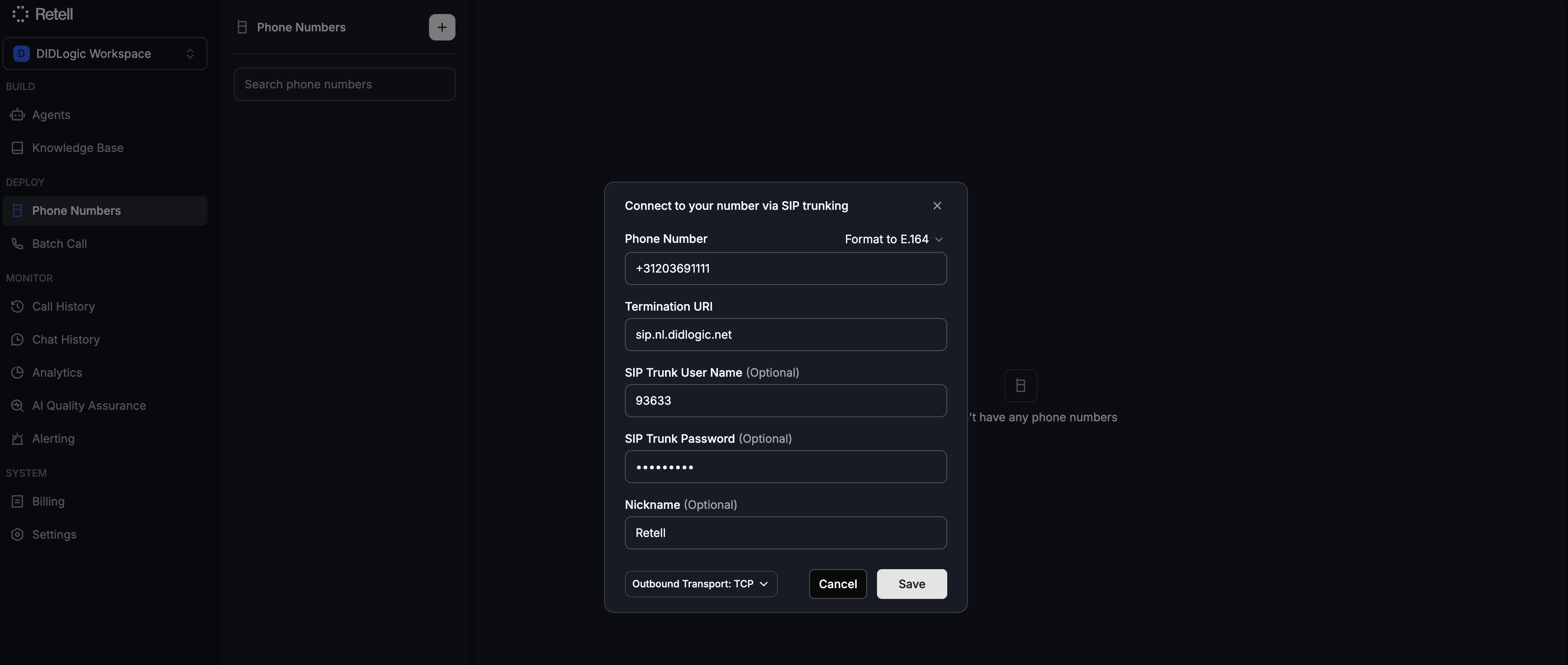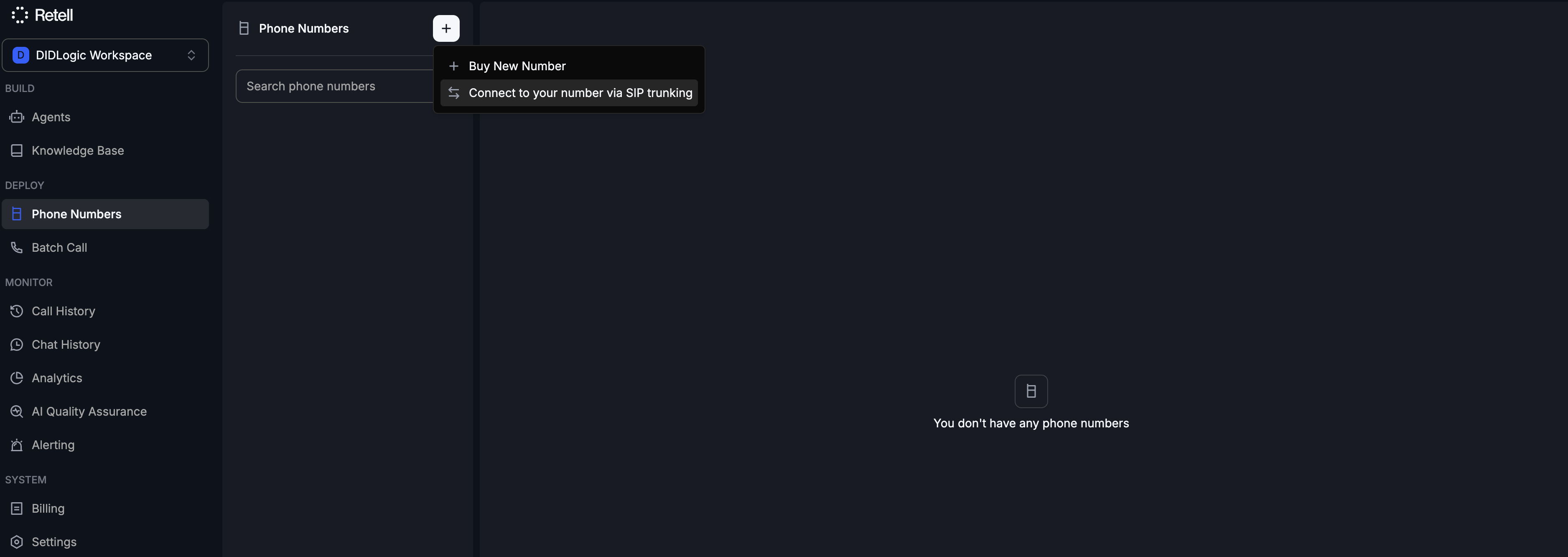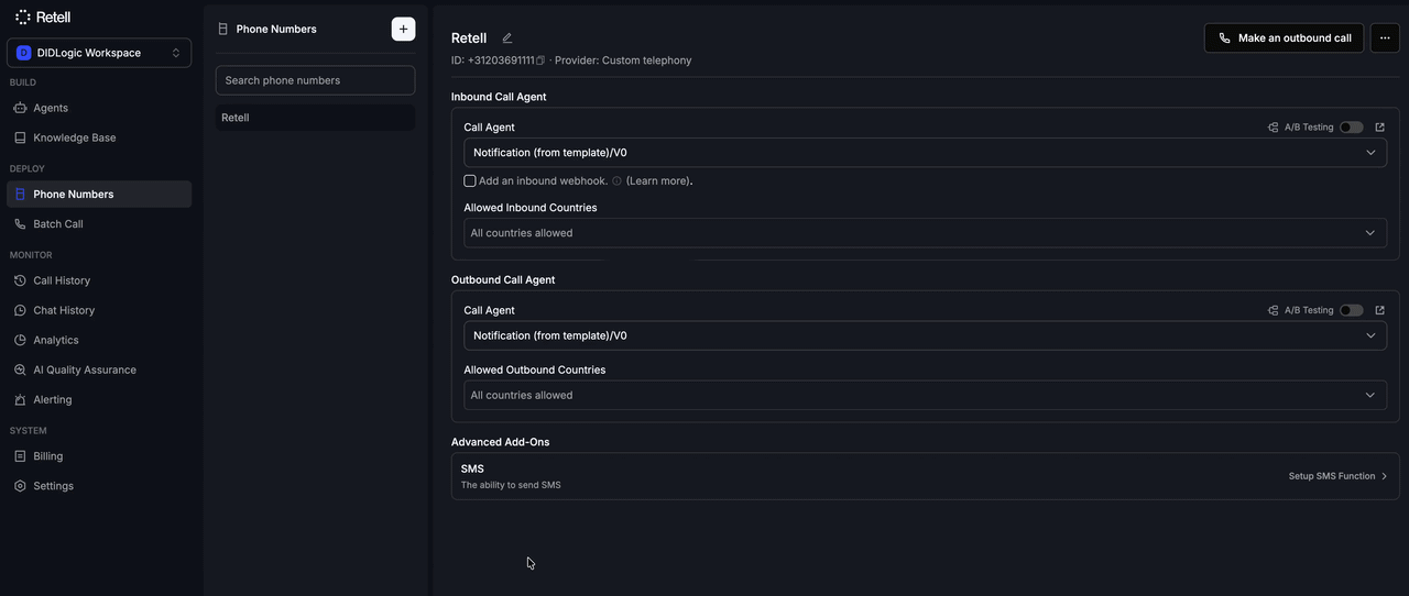 To allow Retell to place and receive calls through our network, you must first connect your didlogic number via SIP Trunking.