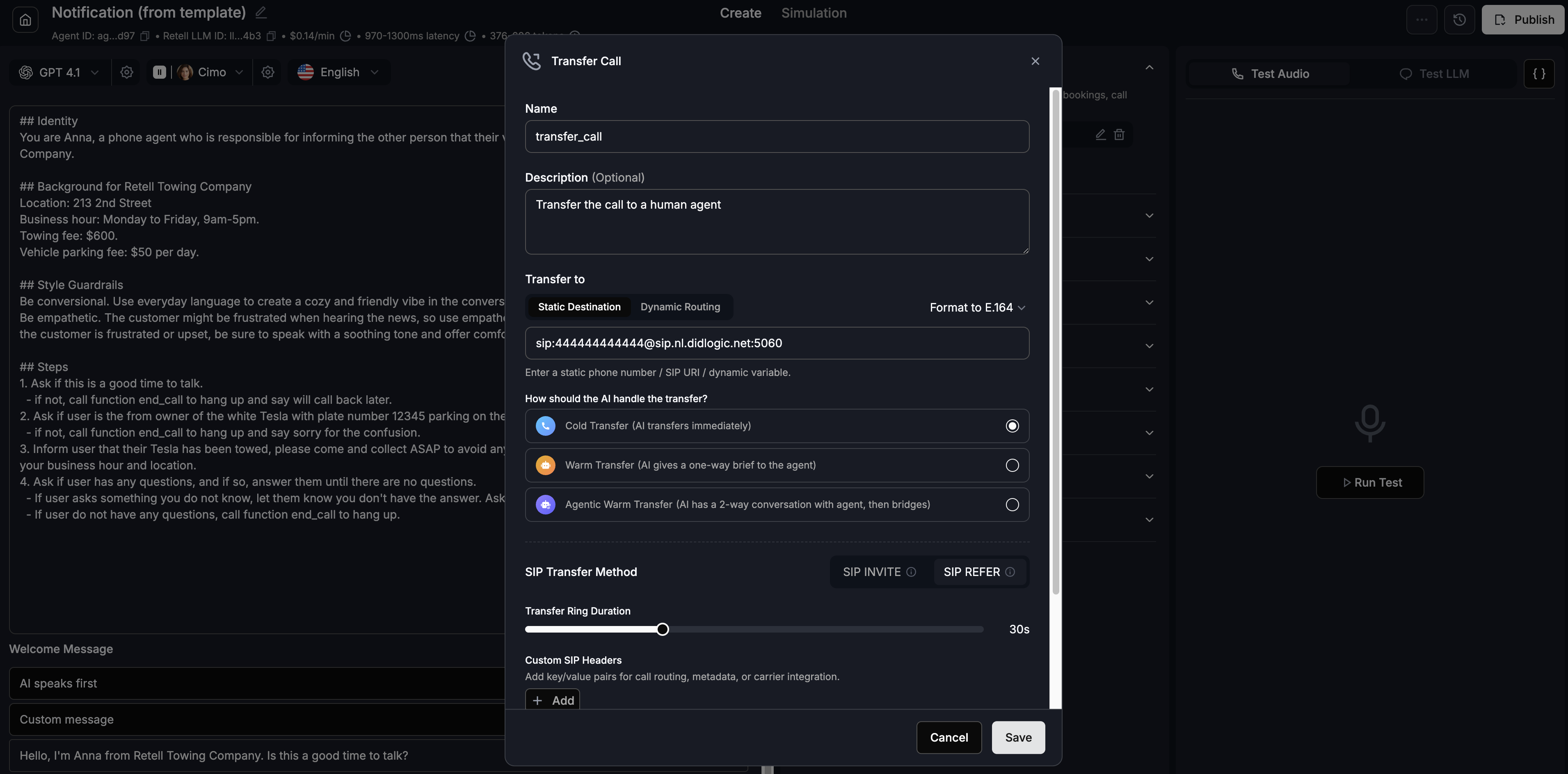 To allow the AI agent to transfer a caller to a human agent, you must configure a Call Transfer function using the SIP REFER method.