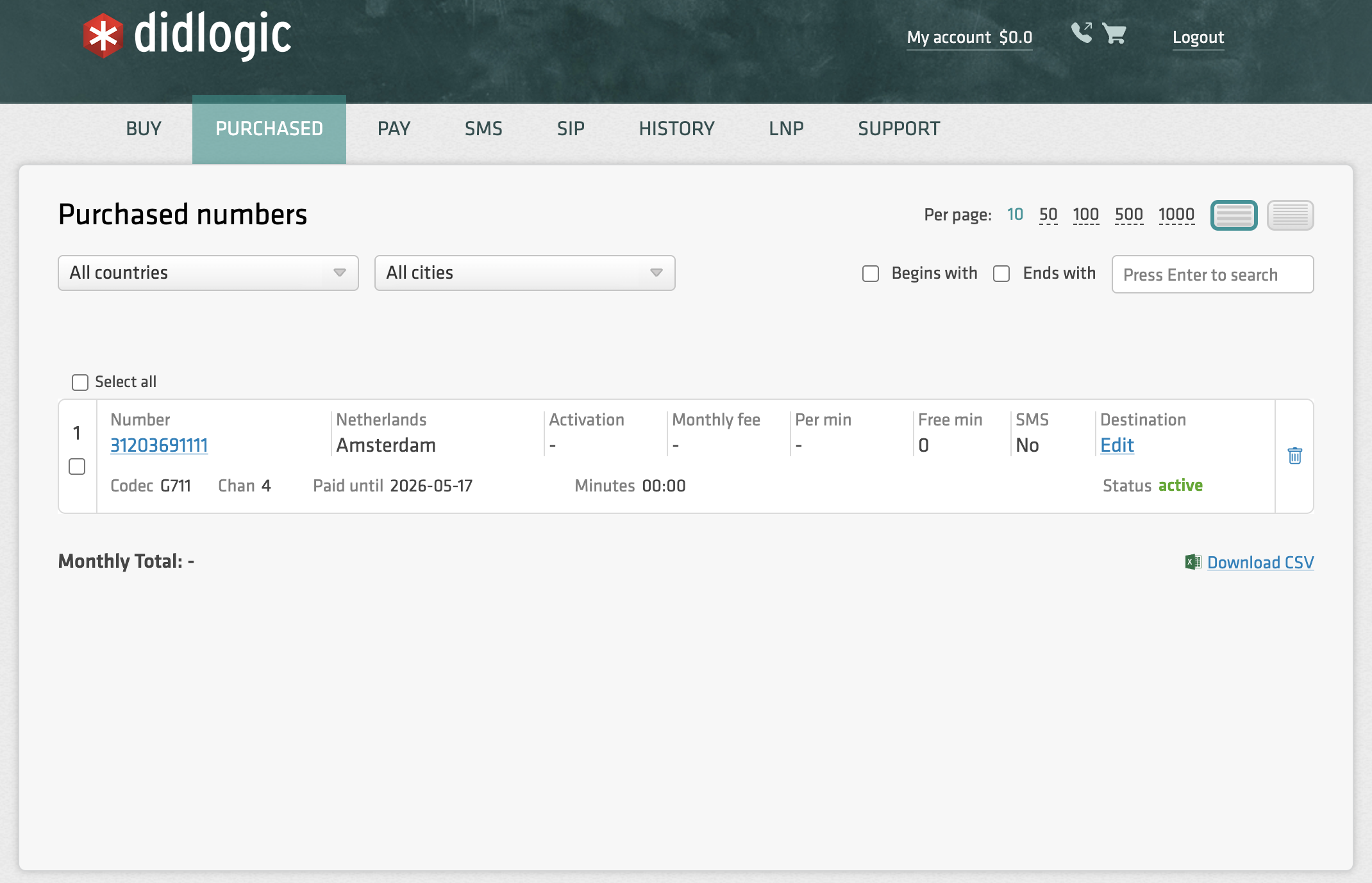 - Phone Number: Your didlogic number in E.164 format (e.g., +31203691111).