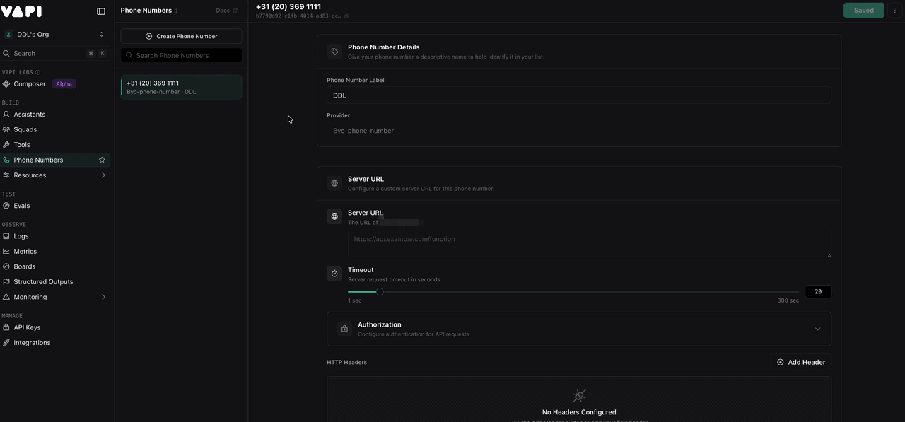 Once you have created the agent, assign it to the phone number by navigating to Phone Numbers and selecting your agent for both inbound and/or outbound calls. After you have assigned the agent, press Save.