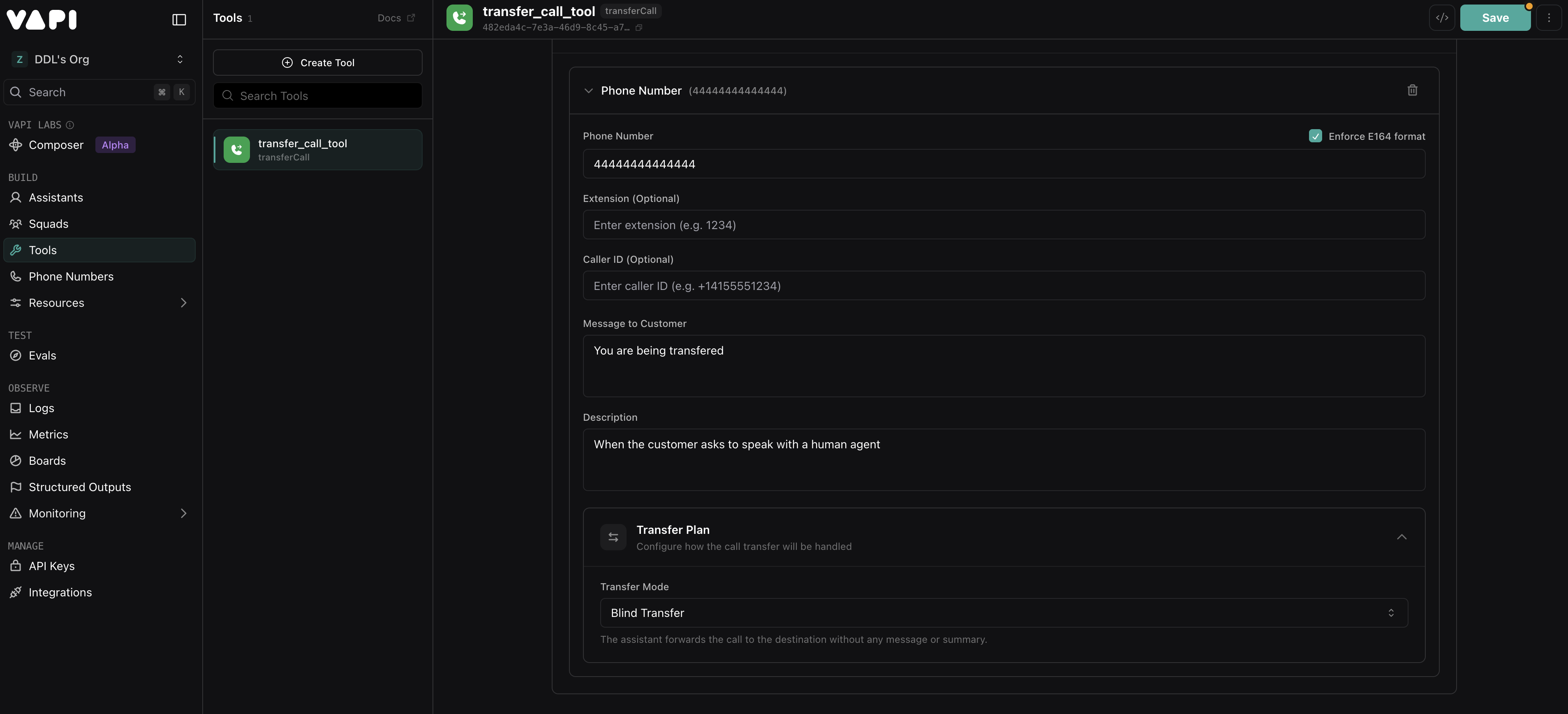 To enable the "Transfer to Human" feature, you must create a specific tool in Vapi.
