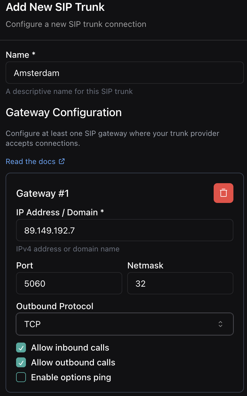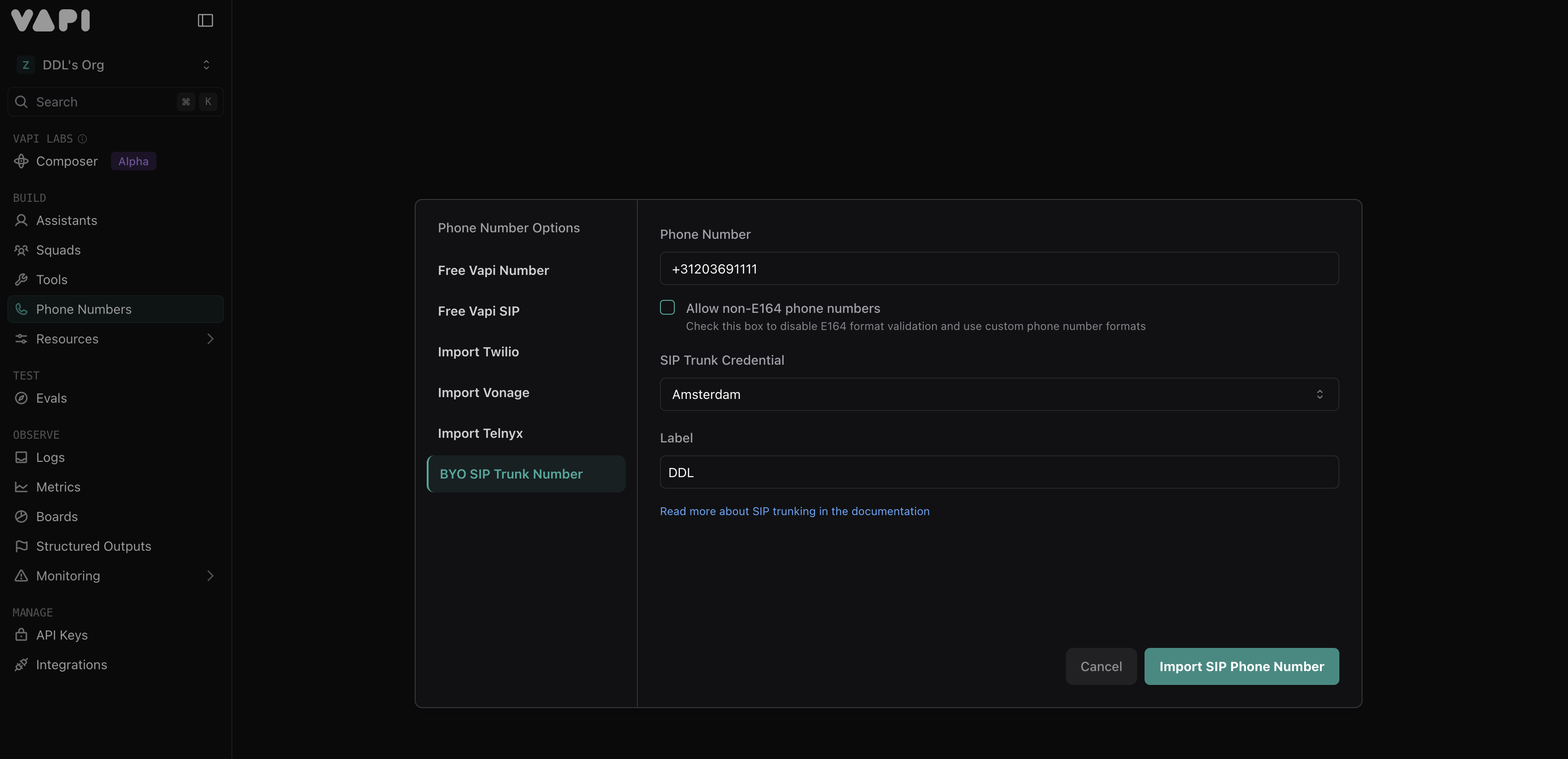 First, you must create a "BYO SIP Trunk" within Vapi to use didlogic as your telephony provider.