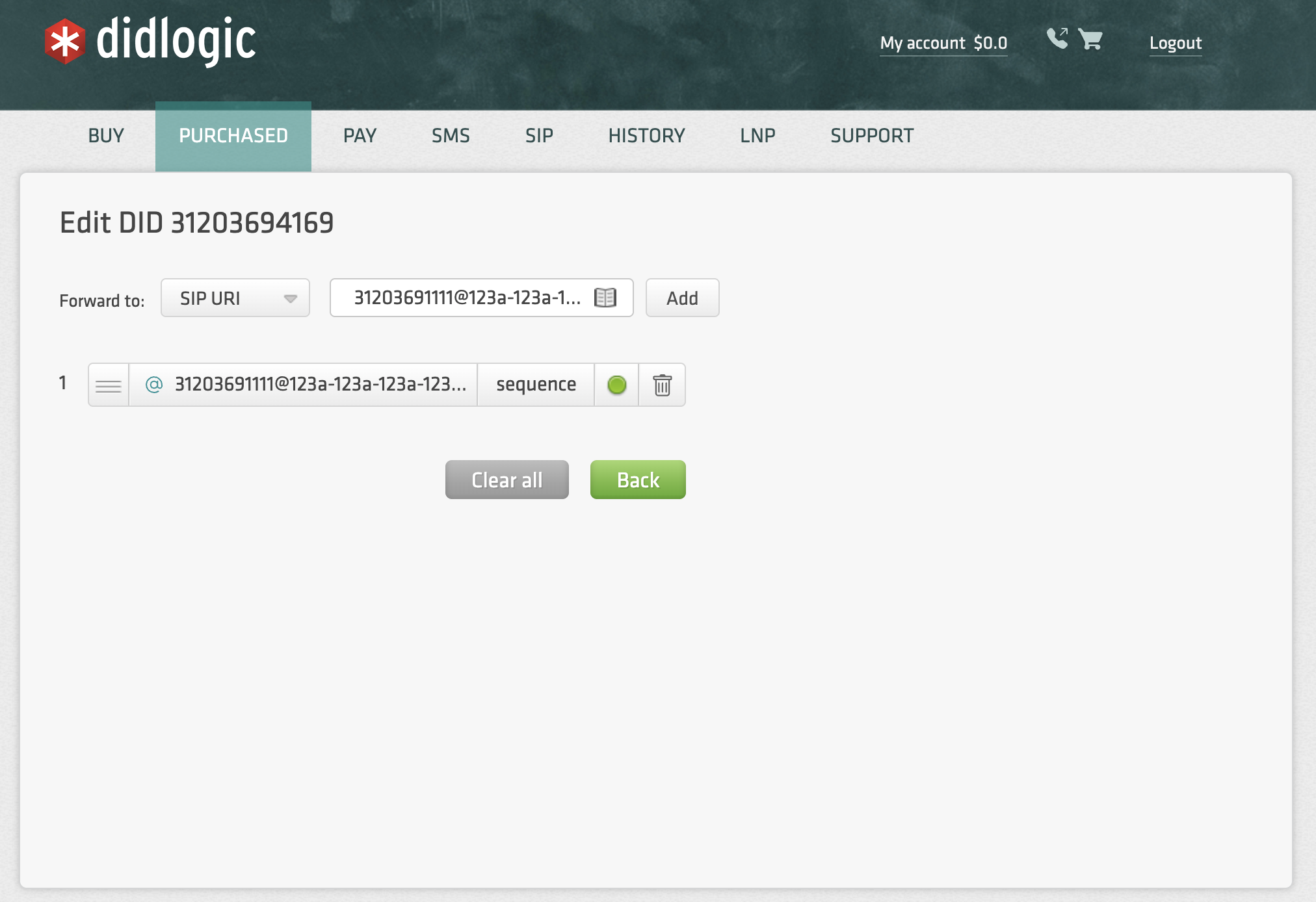 In the Forward to dropdown, select SIP URI and enter the destination in the following format: